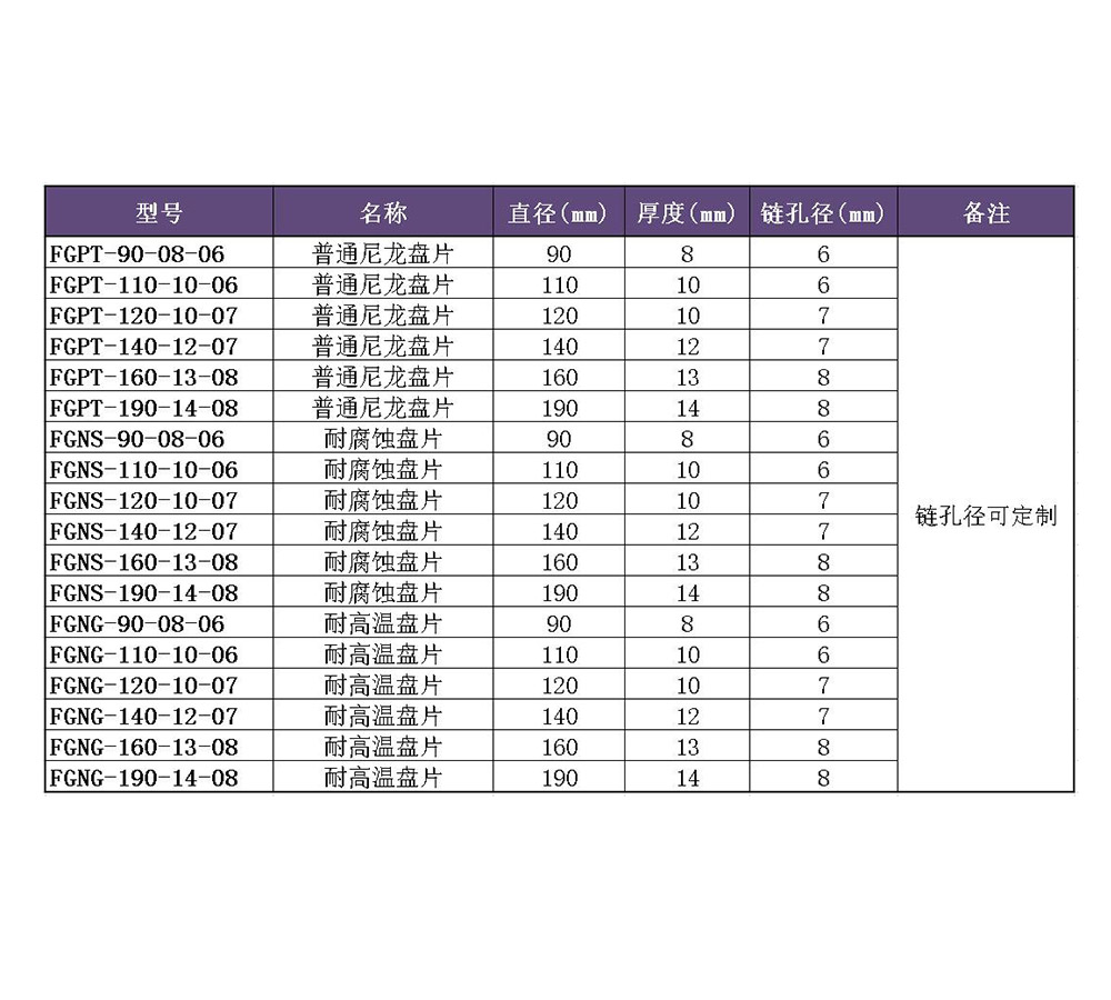 直径90mm、110mm、120mm、140mm、160mm、190mm的管道输送设备尼龙链板(又称链片、刮板、盘片)是管道链板输送机用来承载物料的重要组成部分。具有输送效益高,耐磨,耐酸碱,耐腐蚀,耐高温,抗静电,有韧性,使用寿命长,节能环保等特点。
